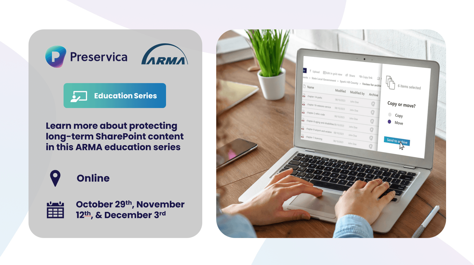 Join us this fall for our on-demand 3-part series emceed by Margaret Heremesmeyer, Director of ARMA International, where experts in Microsoft 365 records management and digital preservation explore the importance of digital preservation archiving, share best-practice guidance & practical steps you can take to standardize & automate the governance of long-term (> 7 years) records in Microsoft SharePoint.