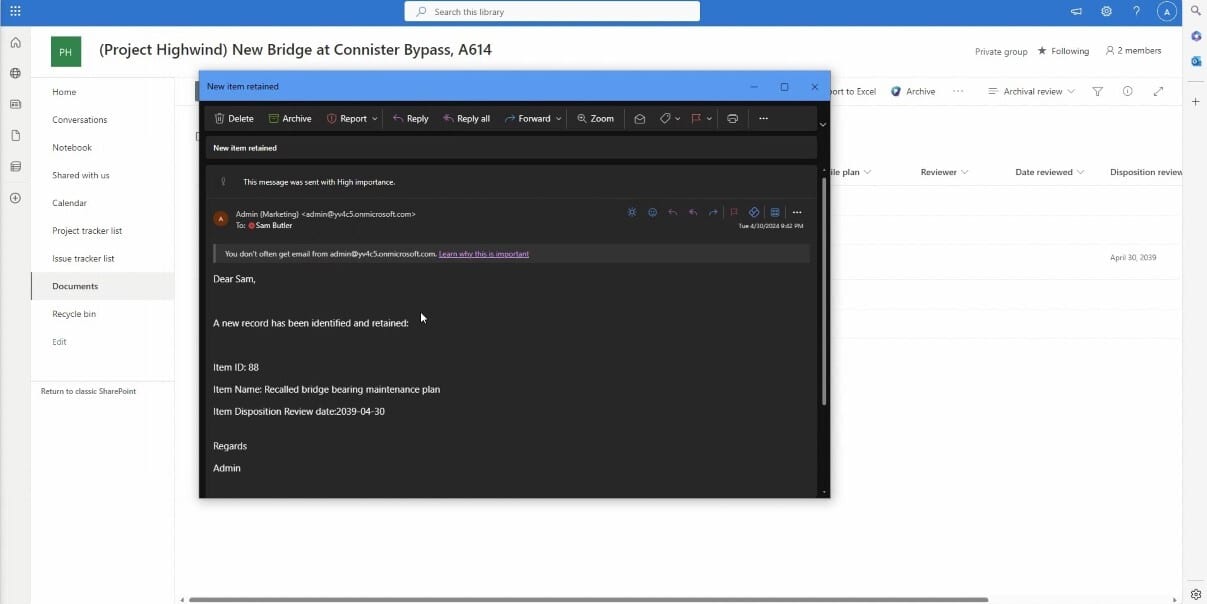 Our first example is a civil engineering organization utilizing both Preserve365 and Power Automate to carry out classification, archiving and notification without having the records management team ever needing to click a button once the workflow is built.