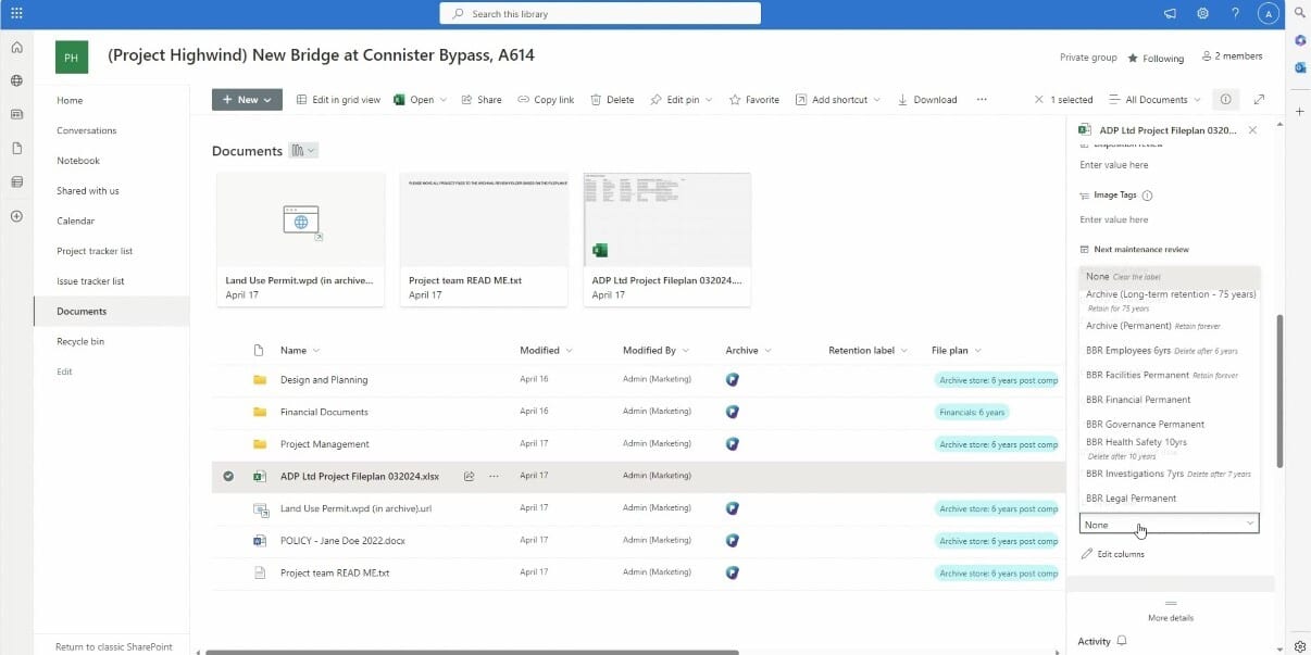 The organization has a large SharePoint site that documents a major civil engineering project. The project is for the construction of a bridge and includes documentation and records that need to be retained and archived long-term when physical assets are decommissioned, so they can be easily retrieved later for safety, maintenance or litigation.