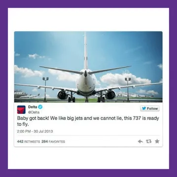 Here's another great example from @Delta - Delta Airlines' account that parodies the famous Sir-Mix-A-Lot song, "Baby Got Back".