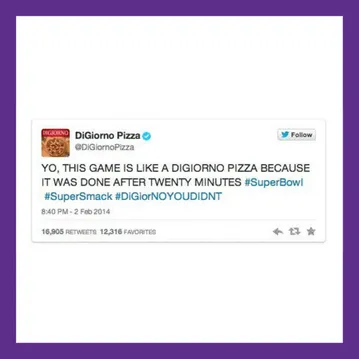 Or, this brilliant moment from frozen pizza company DiGiorno Pizza @DiGiornoPizza during the super bowl 48 in 2014. If you don't remember Super Bowl XLVIII, I can't say I blame you. The game was historic, but perhaps for the wrong reasons. The game was the largest margin of victory for an underdog and is tied for the third-largest point differential in Super Bowl History. It was a blow-out where the Seattle Seahawks defeated the Denver Broncos 43–8. One of the most entertaining moments of the entire game happened off the field on Twitter with this tweet.