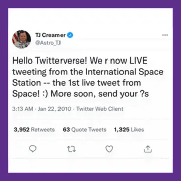 This tweet from NASA Astronaut TJ Creamer is the first tweet from space: