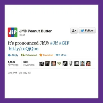 Our first example comes from @Jif - Jif Peanut Butter's account where they weighed in on the GIF pronunciation debate - Is it Gif or Jif?