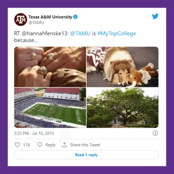 The Texas A&M account, @TAMU participated in a campaign around the hashtag, #MyTopCollege. The response from students provides a series of unbeatable testimonials like the one pictured above.