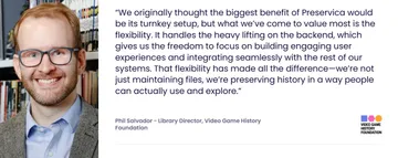 ““We originally thought the biggest benefit of Preservica would be its turnkey setup,” Salvador explained. “But what we’ve come to value most is the flexibility. It handles the heavy lifting on the backend, which gives us the freedom to focus on building engaging user experiences and integrating seamlessly with the rest of our systems. That flexibility has made all the difference—we’re not just maintaining files, we’re preserving history in a way people can actually use and explore.” Phil Salvador - Library Director, Video Game History Foundation”