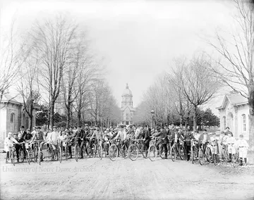 A group of minim students with bicycles on Main Quad with Main Building in the background, Porter House to the left, and the Post Office to the right, c1890s. Caption: "Bicycle Army." University of Notre Dame Archives, GGPN 15/04